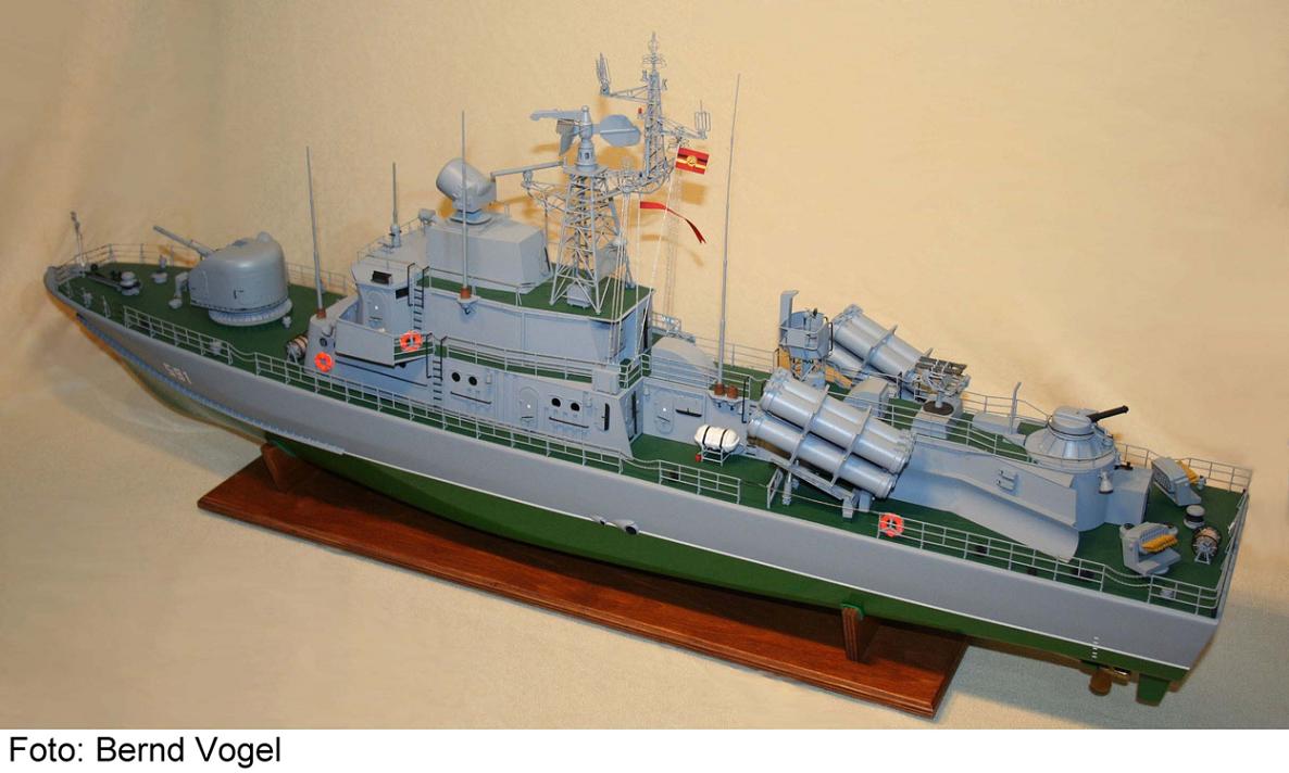 Das Raketenschnellboot wird im M 1:50 über alles 975 mm lang, 177 mm breit und hat einen (Rumpf-)Tiefgang von 43 mm. Es darf dabei nicht viel mehr als 2,90 kg wiegen. Mit dem Plan (Seitenansicht, Draufsicht und Spantenrisse in den Maßstäben 1:50 und 1:33,33) kommen zwei Schiffsdetail-Zeichnungen vom 76-mm-Geschütz und vom Raketen-Vierfachstarter, beide im M 1:50 und eine Foto-CD-ROM mit 364 Fotos (alles im Preis enthalten).