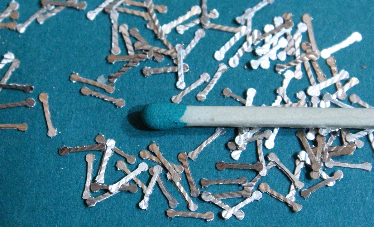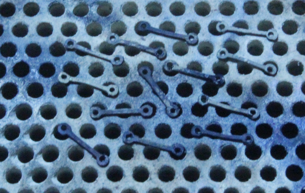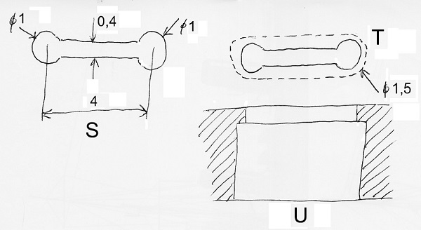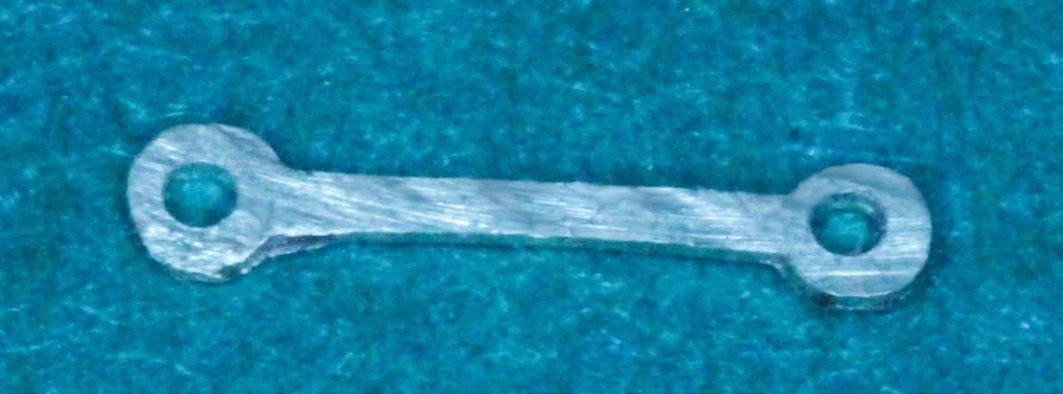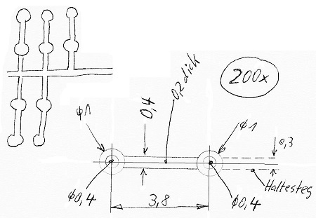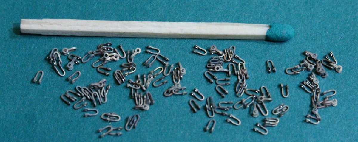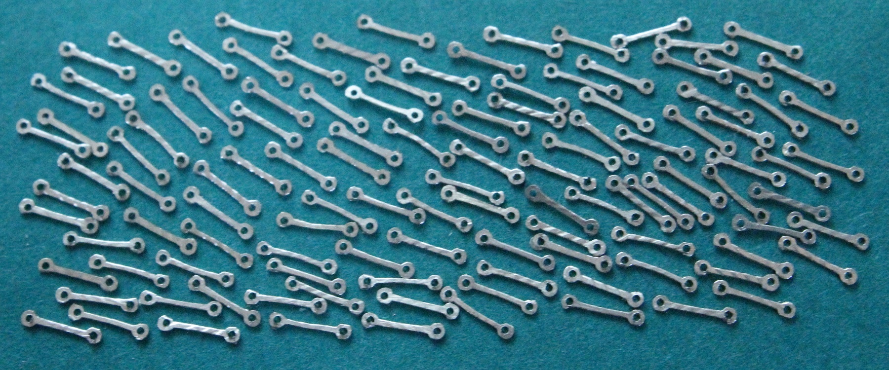 Meine Schlußfolgerung: ich mache die Teile selbst und eröffne hier einen eigenen Fotoreport darüber. Ausreichend lange habe ich darüber nachgedacht, wie ich diese "Knochen" mit den Löchern an den Enden in dieser Winzigkeit herstellen kann. Ich fand und durchdachte mehrere Möglichkeiten: zwei Varianten biegen aus 0,2-mm-Draht, ein Stanzwerkzeug bauen (ist nicht soooo schwierig, wenn man bereit ist exakt zu arbeiten und wenn man weiß wie) und schließlich ein Profil fräsen und davon 0,2 mm breite Scheiben absägen, danach die Bohrungen mit einer einfachen Bohrvorrichtung einbringen. Anschließend würde ich heute die Schäkel zu U´s biegen - natürlich auch mit einer Vorrichtung.
