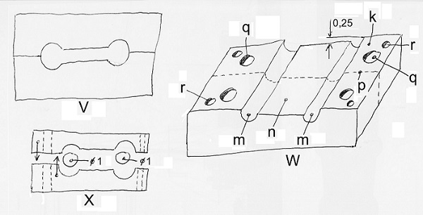 verstiftet werden (X). Bei (W) habe ich die Schrauben-Bohrungen (q) und die