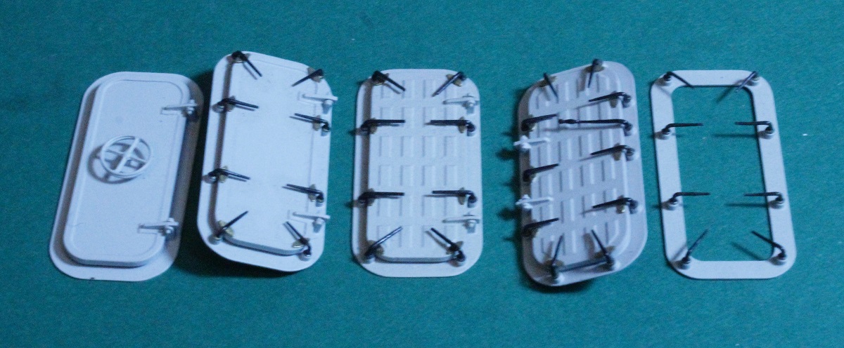 Am vorderen Deckshaus sind die seitlichen Deckshaus-Wände gerundet. Und an diesen runden Flächen sitzen Schott-Türen, welche an der Rückseite vollkommen eben sind. Wenn man diese ebenen Schotten an die runden Flächen anbauen würde, würden sich seitliche Spalten ergeben. Deshalb wird der Zwischenraum beim Schiffbau in der Regel mit einem angepaßten "Sockel" "ausgefüttert". Diese Bauweise findet man oft, weswegen ich meine genaue Lösung ausführlich darstellen will.