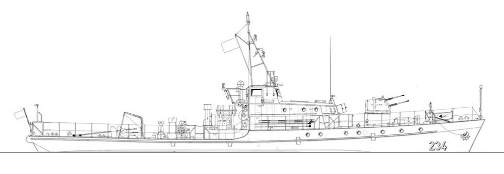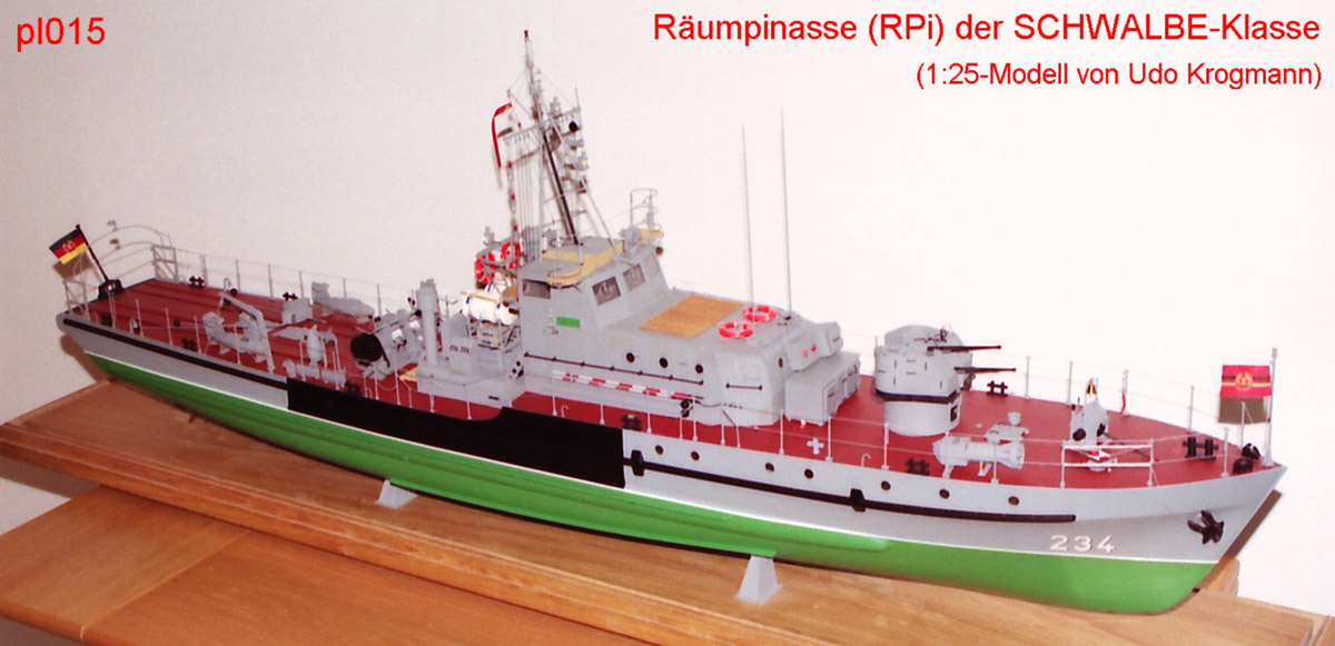 Small coastal minesweeper of the DDR-Volksmarine (east-german navy), (NATO-Code: SCHWALBE-class). Of the 25-mm-AA-gun and the sweeping winch are detail drawings included. Very detailed model plan, many details are drawn in the scale 1:12,5 and were then reduced to scale 1:25 zoomed. Additional body plans in scale 1:33, 1:20 and 1:12,5, hull lines after wharf plan, details from large photos, model-hull-size: 1145 x 174 x 60 (draught) mm, model-weight:5,31 kg, 2 propeller, 2 large sheets and diverse pages, photo-CD-ROM enclouded.