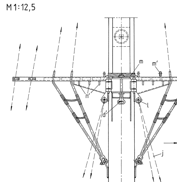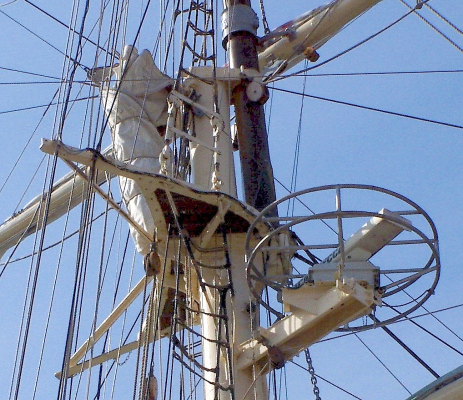 Bramsaling vom SS GREIF (ex WILHELM PIECK). Der Marsrand ist an beiden Seiten nach hinten mit den sog. Ausreckern (L-Profile) verlängert. An diesen sind die langen Pardunen fest, damit sie im Seegang nicht zu sehr schwingen können. Mit dem Eselshaupt ist im Fock-Masttopp nach vorn die hölzerne Fockstenge angesetzt. Darüber sieht man noch das Tonnenrack der hier nach unten gefierten Bramrah. Die Konsole an Steuerbord trägt das Radargerät. Ein Ringkorb hält alle Leinen von dem drehenden Radarbalken fern. Hinter der Konsole erkennt man den (Ketten-)Hanger der nicht-fierbaren Marsrah. Dieser ist am Auge d´ vom Planausschnitt fest. An der Hinterkante vom Masttopp ist das Großstengestagsegel aufgegeit.