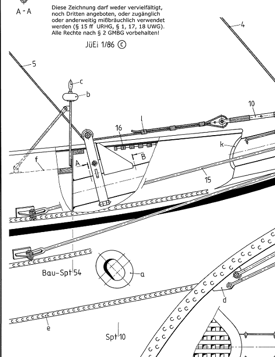 Äußeres Ende vom Hornbugspriet Segelschulschiff WILHELM PIECK. Der Außenklüver, mit seinem Stagliek an den zahlreichen Legeln (kleine Ringe) hängend, ist gezurrt. Rechts oben erkennt man den Block von Außenklüverausholer und links-unten das Klüvernetz. Die unten angebolzte Spannschraube gehört zum Stampfstag (30 mm Durchmesser).