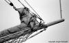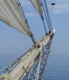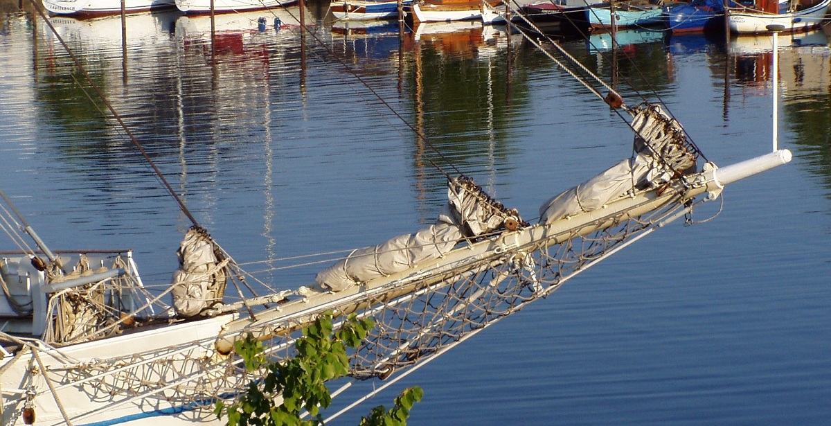 Mit Teleobjektiv fotografiert: Bugspriet der GREIF. Ganz rechts der angebundene Außenklüver mit dem Ausholer, hier ein Block mit Hanfläufer. Links davon der Mittelklüver und dann am doppelten Innenklüverstag der Innenklüver. Beide werden von einem dünnen Draht-Läufer ausgeholt (Handläufer der Taljen auch hier Hanfseil). Ganz links unter der Nagelbank erkennt man noch die Stagfock am Fockstag. Die Stagfock wird ebenfalls von einem doppelten Hanfläufer ausgeholt. Zwei Niederholer erkennt man nahezu waggerecht zur Nagelbank fahren. Die GREIF hat nur einen sehr kurzen Stampfstock (etwa auf halber Länge nach unten zeigend), welcher die Knickbeanspruchung von diesem konischen Stahlrohr nimmt.