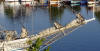 Bugspriet bei gesetztem Vorgeschirr. Rechts neben ihm erkennt man die Holzblöcke von zwei Klüver-Niederholern. Das Klüvernetz ist zwischen den beiden Klüvergeien (14-mm-Stahldraht) eingeflochten. Auf dem Bugspriet liegen die Spannschrauben zum Steifsetzen der Stage.