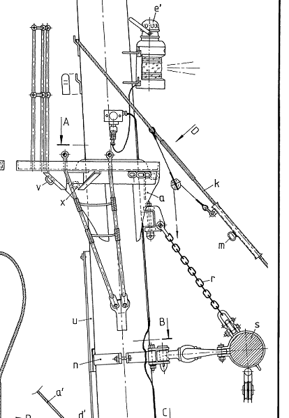 Die Marssaling sitzt bei der GREIF etwa auf halber Höhe vom Fockmast. Sie dient zum Spreizen der Toppwanten und damit der Querstabilität dieses Stahlrohr-Masts. Der vordere Marsrand ist nahezu ein Kreisbogen. Hier sieht man untenan drei (Holz-)Wegweiserblöcke der Fockgeitaue. Der hintere Marsrand trägt ein kurzes Relingstück. Von oberhalb der Saling sieht man nach rechts-unten die doppelte Stagfock (k Planausschnitt) fahren und daran angebunden der Block für den Stagfockausholer. Darüber eine Blechplatte mit zwei Haken. Hier war mal das Dampferlicht aufgesteckt. Im Planausschnitt sieht man noch diese Laterne. Die Hangerkette (r) für die Fockrah sieht man rechts-unten.