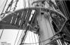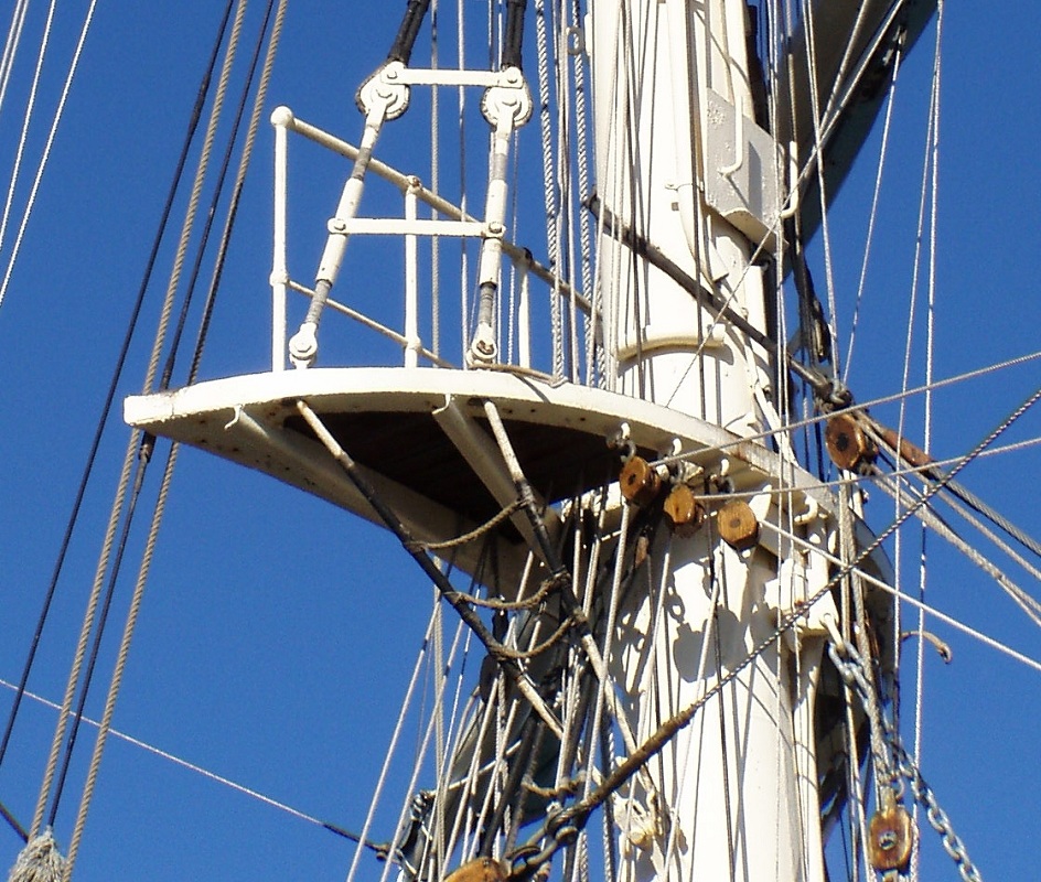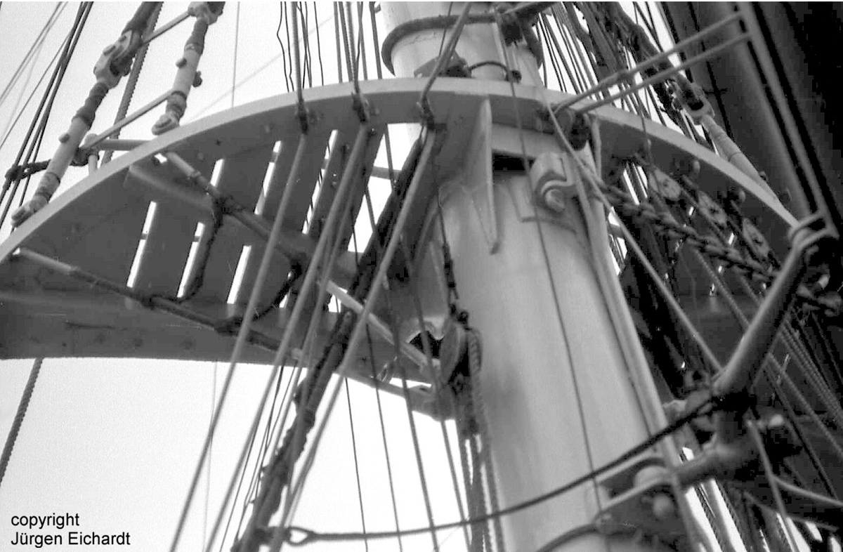 Älteres Foto der Marssaling von vorn-unten. Hier sind die Geitaublöcke noch aus Stahl (erkennt man rechts). Unter dem Marsrand das Schwenklager für die Hangerkette der Fockrah und am unteren Bildrand das Schwenklager für das Bügelrack der Rah. Hier sieht man auch die Abstände zwischen den Leistenbelag der Saling und die großen Zwischenräume, durch welche die Augen der Fock-Unterwanten und div. Leinen des Laufenden Guts fahren.