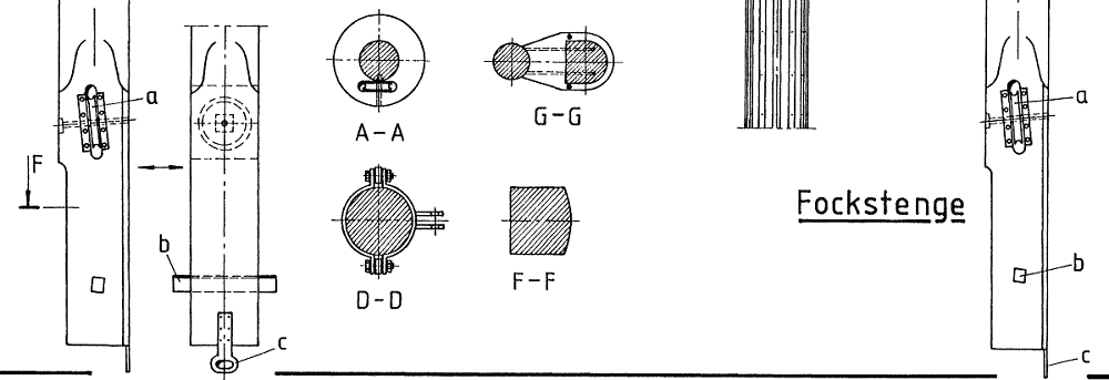 Die (Holz-)Fockstenge vom SSS GREIF (Hanse-Sail 2015). Am unteren Bildrand sieht man die Steuerbord-Nock der Bramrah. In der Mitte die Royal-Rah. Sie ist in die unterste Stellung weggefiert. Mit einem sog. Tonnenrack ist die beweglich an der Fockstenge. Dieses ist innen mit Leder ausgeschlagen und die Stenge hat im Heißbereich außen angeschraubte, schmale Kupferleisten (erkennt man bei dem Foto nicht), damit das Rack leicht auf- und niedergleiten kann. Beide Rahen sind nach Backbord gebrasst. Bis hoch zum Stengetopp gibt es eine Strickleiter, welche zwischen den hintersten Pardunen eingewebt ist. Der Block in Bildmitte ist der Fallenblock für die Royal-Rah, vom Block hoch bis zum Scheibgatt in der Stenge und dann herab bis zur Rah ist es wieder ein Draht-Stander.