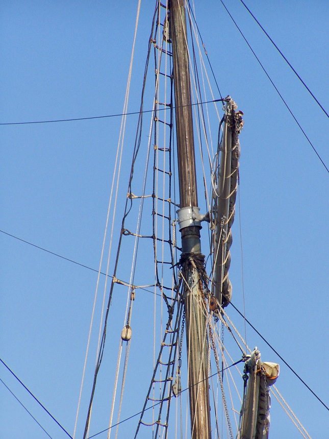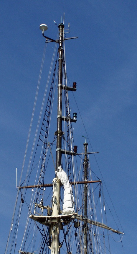 Die Großstenge der GREIF bei "Kaiserwetter" von hinten fotografiert. Unten die Großsaling, das Gaffeltoppsegel ist nach Steuerbord angebunden, dann die waagerechte Signalrah, links an deren Ende eine Funkantenne, an drei seitlichen Konsolen sitzen Signal-Laternen, die Topp-Wanten und weiter oben zusätzlich eine Pardune sind zum Besteigen der Stenge mit Webleinen ausgewebt, links sieht man die Steuerbord-Brasse vor zur Royal-Rah fahren. (Eine Foto-CD mit 400 Fotos von der "Wilhelm" und von GREIF kann man bei mir erwerben)