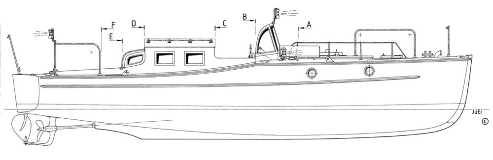 Offenbar gab es Boote mit und – wie in meiner Zeichnung dargestellt – ohne Schornstein. Bei der Schornstein-Variante stand dieser (etwa 1 m hoch und 60 cm breit) mit leichtem Fall in der Mitte der vierteiligen Windschutzscheibe. Deshalb war der Steuerstand dabei leicht nach Backbord versetzt. Diesen Versatz behielt man auch bei den Booten ohne Kamin bei. An der Steuerbord-Seite war an der Stelle die Tür zum Motorraum. Damit dieser Einstieg eine ausreichende Höhe bekam, hatte er ein schräges Dach und der Boden der Steuerplicht hatte im Schwenkbereich der Tür eine 350 mm hohe Vertiefung (vgl. Draufsicht und Schnitt B-B). Am Boden des Steuerstandes liegt eine Gräting. Rechts daneben ragt der Umsteuerhebel des Boots-Wendegetriebes heraus. Ein verdeckter Kettentrieb fährt vom Handrad zur Kardanwelle an der Backbord-Seite des Rumpfes (B-B). Diese Welle überträgt die Lenkbewegungen zum Ruderquadranten unter dem Heckdeck. Am Heck gab es eine offene Plicht (in der Literatur auch „Cockpit“ genannt) mit lederbezogenen Sitzbänken. Das geschlossene Cockpit lag davor. Das Spiegelheck war V-förmig geschnitten und stand leicht schräg.