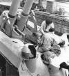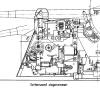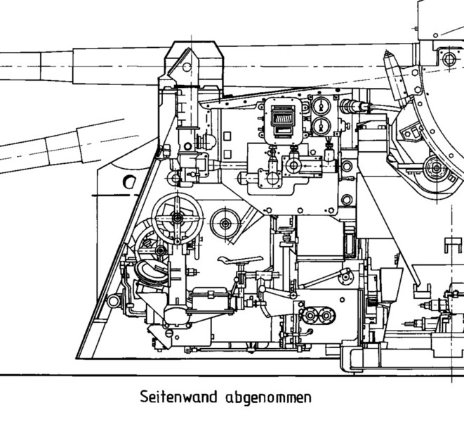 Die Schildzapfenlager (o) ragen an den Wiegenträgern weit nach hinten heraus. Das ist nötig, damit die Waffen auf höchste Elevation von 80° gekurbelt werden können, wie in der Seitenansicht auf Blatt 2 dargestellt. Nur so stoßen die massiven Bodenstücke der Rohre nicht am Ständer an. Der Rohrrücklauf ist bei 80° Rohrerhöhung mit 300 mm am größten. Gestrichelt habe ich ihn in der Seitenansicht mit dargestellt (o´). Weder bei den großen Rohrerhöhungen noch bei Depressionslagen ist das Nachladen der Waffen mit den 1228 mm langen und fast 19 kg schweren Patronen (vgl. rechts neben dem „Maßstabsmann“) von Hand möglich. Für das Nachladen müssen die Rohre in eine relativ bequeme Schräglage gefahren werden. Ein Lademotor (p) unter einer Blechabdeckung treibt über eine Zwischenwelle (q) Gummiwalzen im Bodenstück. Diese ziehen die schweren Patronen sehr schnell in den Ladungsraum hinein. Die Waffen haben einen Fallblockverschluß und können übrigens an beiden Seiten eingebaut werden, es also gibt keine linken oder rechten Ausführungen. Alle Bedienelemente am Bodenstück können auf die jeweils außen liegende Seite gewechselt werden. Unter den Blechabdeckungen befinden sich mittig die Rücklaufbremse (r) und die je zwei Federvorholer (s).