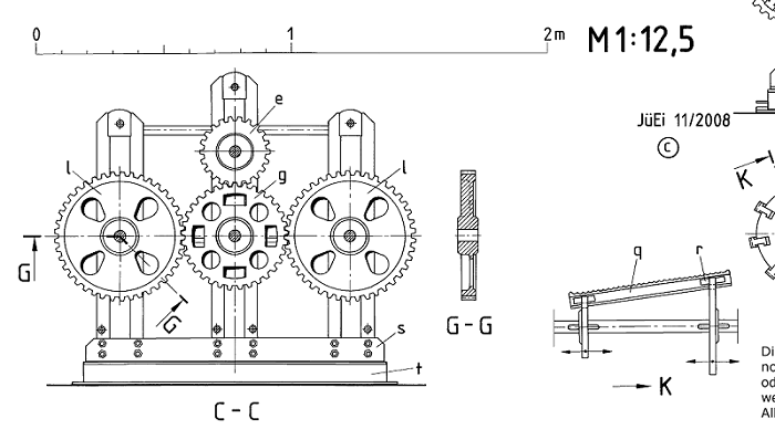 Eine Brassenwinde auf dem SSS KRUSENSTERN (Kieler Woche 1005). Die drei untersten Rahen sind fast vollständig nach einer Bordseite gebrasst. Stünden die Rahen quergebrasst, wäre auf allen konischen Trommeln die gleiche Menge (Edel-)Stahlseil. Das Ritzel der Handkurbel-Welle ist ausgerückt, die Bandbremse (links) angezogen. Die beiden Handkurbeln sind nach innen aufgesteckt. Die oberen, leichteren Rahen werden von der Winde nicht gebrasst, das geschieht weiterhin über Taljen von Hand.