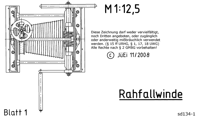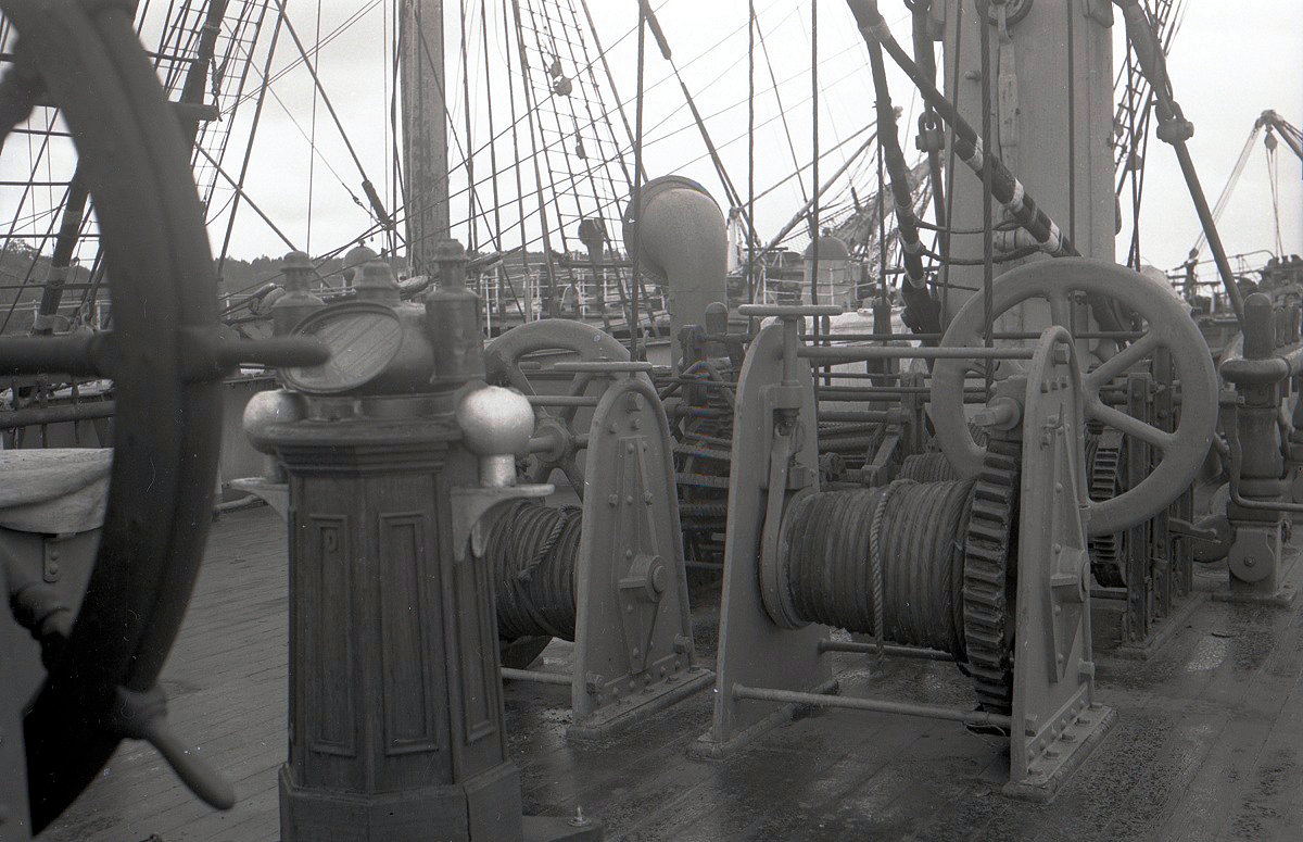 Rahfallwinde auf einem historischen Foto der Viermastbark PASSAT (heute Museumsschiff in Travemünde). Rechts der rückdreh-stoppende Schneckentrieb mit einem schweren Hand-Schwungrad; links an der anderen Seite der konischen Trommel eine Bandbremse. Die Trommel trägt fast kein Drahtseil, daher ist die Rah weggefiert.