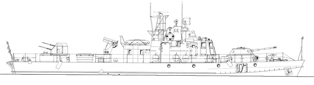 Die Boote waren recht unterschiedlich bewaffnet. Als Hauptwaffe fuhren die Boote auf der Back einen 76-mm-Turm vom leichten Schwimmpanzer „PT-76“. Dafür waren 150 Granaten an Bord. Im hier abgebildeten Generalplan gibt es am Heck einen kleineren Turm mit zwei überschweren MG´s „2M-7“ und zwei relativ kurze Minengleise. Spätere Boote haben am Heck einen 25-mm-Flak-Zwilling „2-M-3“, diesen allerdings mit einem nach innen schrägstehenden Aufsatz auf dem üblichen Splitterschutz. Mittschiffs war oft ein BM-14-17-Raketenwerfer zu sehen. Die 17 steht hier für die Anzahl der Rohre (Kampfsatz: 34 Raketen an Bord). Der Werfer für ungelenkte Raketen mit einem Kaliber von 140 mm wurde bereits in den 1950er-Jahren für die Landstreitkräfte entwickelt. Ab 1959 gibt es die navalisierte Version. Die Raketen mit einem 18,8-kg-Sprengkopf können in einer Salve innerhalb von 7 bis 10 Sekunden auf maximal 10 km Reichweite gestartet werden. Teilweise war auch ein Startgerät für Panzer-Abwehr-Flugkörper Typ „Maljutka-AT3A“ installiert. Alle Boote hatten Minengleise zur Aufnahme von: vier Minen „UDM-500“ oder 2 x „UDM-1000“ oder sechs „KPM“ oder acht kleine Minen „JAM“ am Heck. In Höhe Spant 5 sieht man an Seite Deck vier Sliplager für Nebelbehälter. Auch mit entsprechender Elektronik waren die Boote ausgestattet: Radar „Donets-2“, Nachtsichtgeräte, Echosounder „NEL-7“, KW- und UKW-Radio, Gyro-Kompaß „Gradus-2“.