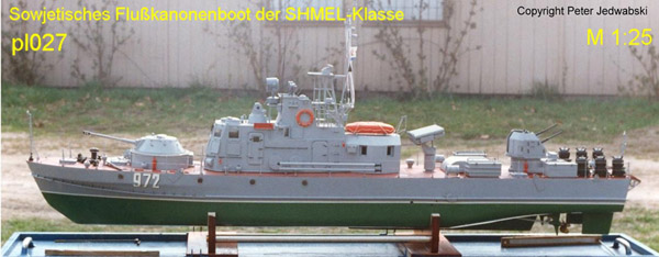 Auf dem Deckhaus gibt es einen kleinen Sommerfahrstand, dahinter einen Vierbeinmast mit Radargerät. Die hinten angesetzte Stenge kann für Brückendurchfahrten umgeklappt werden. Vor dem Fahrstand stehen ein großer Scheinwerfer und davor die Kuppel vom Infrarot-Nachtsichtgerät. An Achterkante Deckhaus ist in meiner Skizze ein Ladebaum angebracht, mit dem das Beiboot bedient wird. Bei einigen Booten gibt es an dieser Stelle eine Kasematte mit vier Schießscharten, aus denen MG-Schützen feuern können. Oben ist diese offen. Als ich zu DDR-Zeiten meinen ersten Modellplan vom „Flußkanonenboot“ nach wenigen aber sehr guten Fotos, aufgenommen von einem Hobbyfreund im damaligen Leningrad, gezeichnet habe, wußten wir noch nichts von dieser Tatsache. Die Modellbaugruppe um Günter Jedwabski (Jette) hat nach diesem Plan eine Serie von 1:25-Modellen gebaut, welche als „Buna-Wasserballett“ bekanntgeworden sind. Das Foto oben zeigt eines dieser Boote. Nach heute zur Verfügung stehenden besseren Unterlagen konnte ich eine neue Skizze von der SHMEL-Klasse und einen authentischen Spantenriß im M 1: 50 anfertigen.