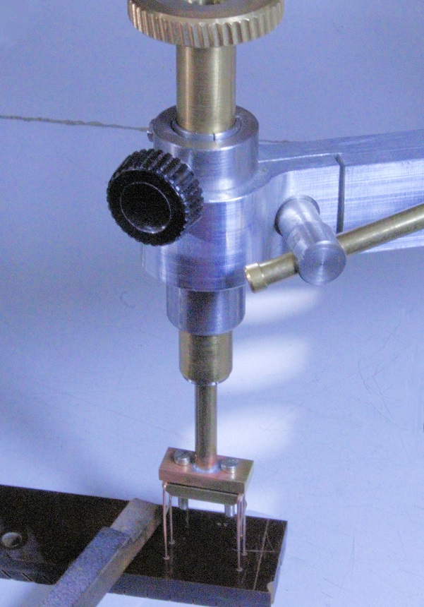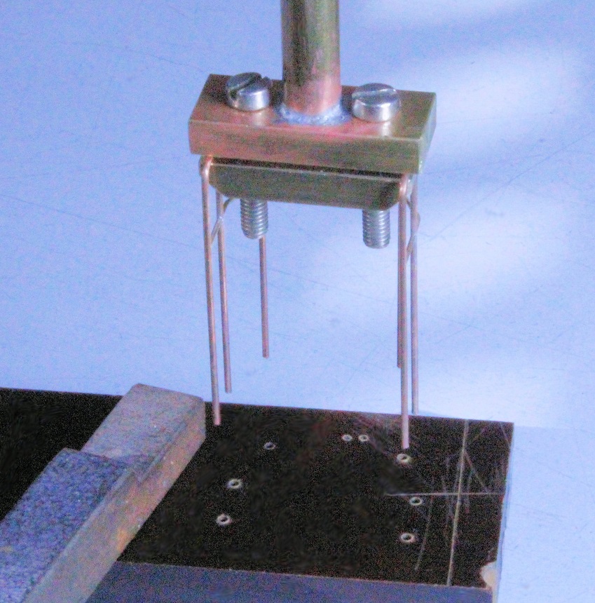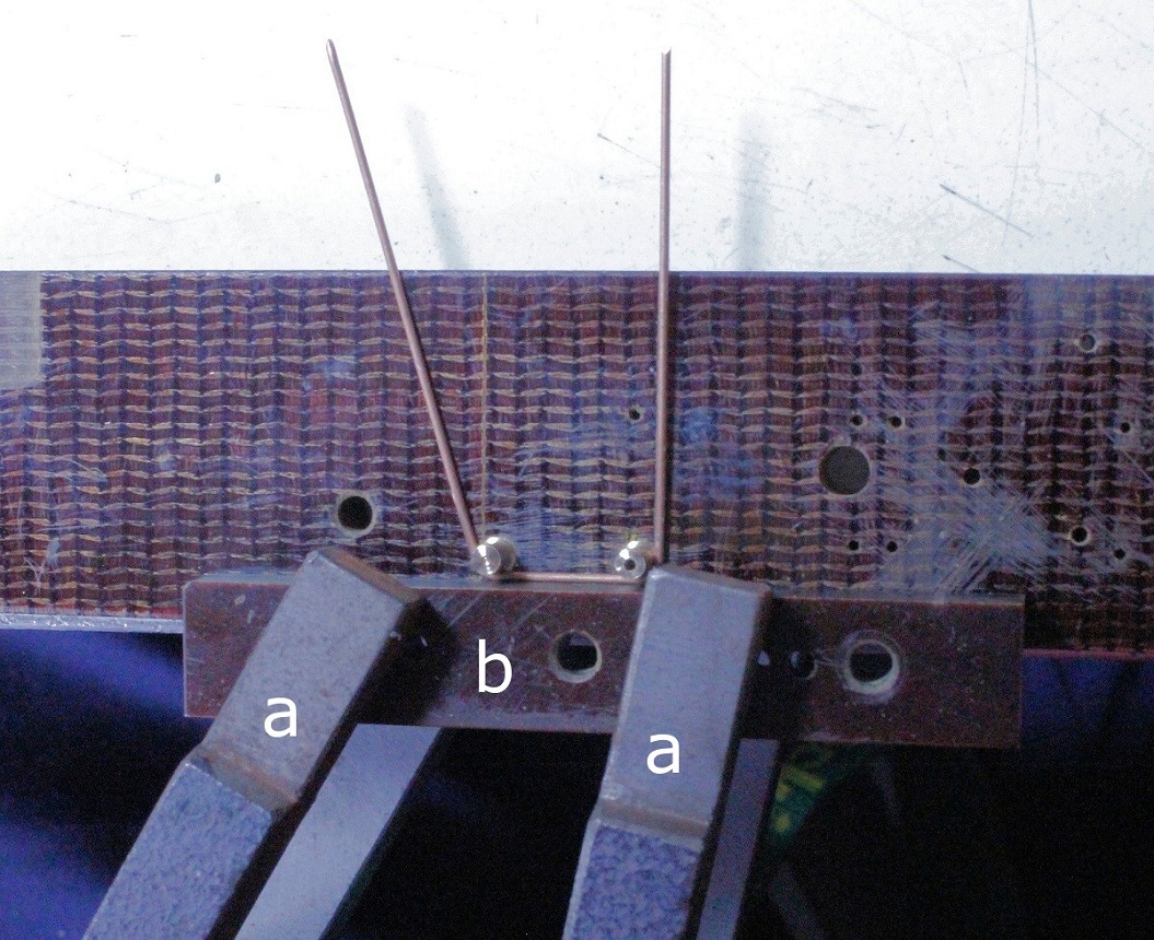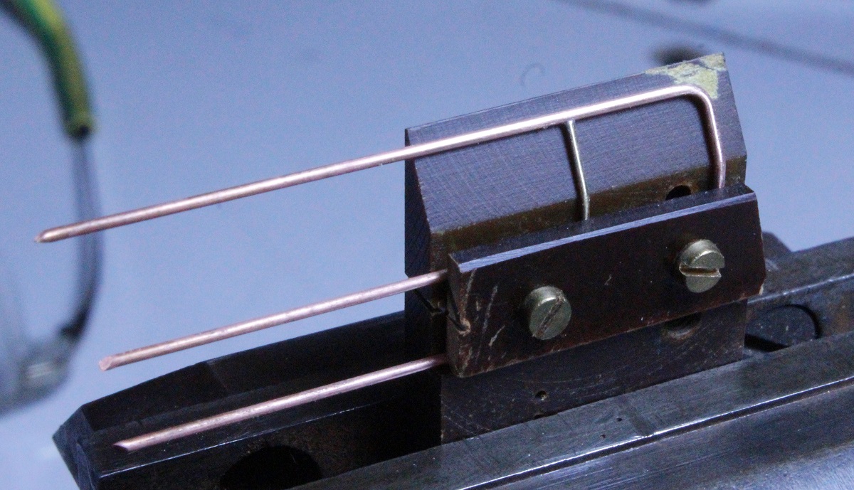 Zwei Messing-Stifte, im richtigen Abstand in eine Pertinax-Platte gesteckt,