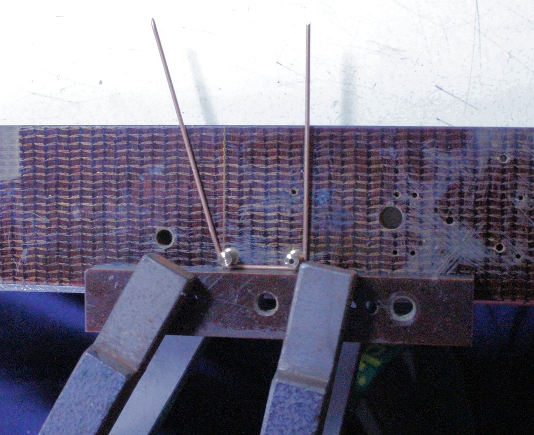 abgebohrt. Zwei eingesteckte 0,8-mm-Drähte verhindern ein Verrutschen. Die