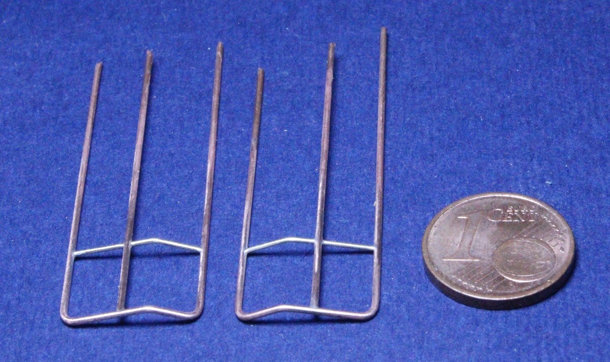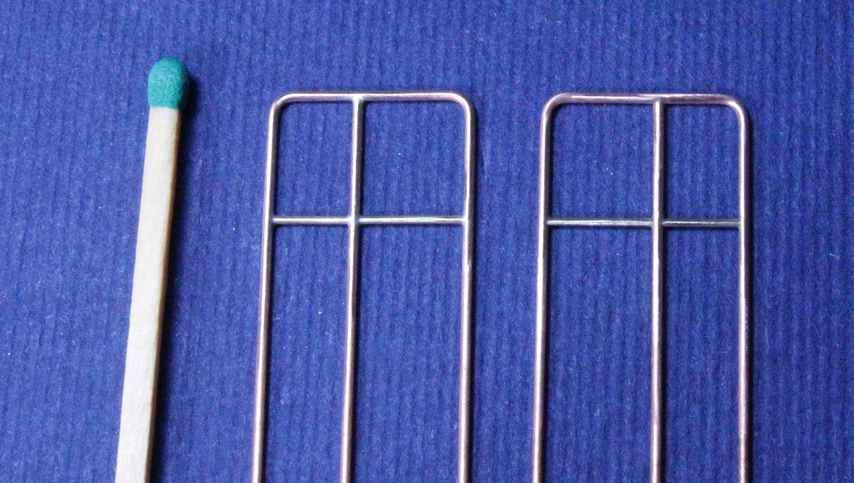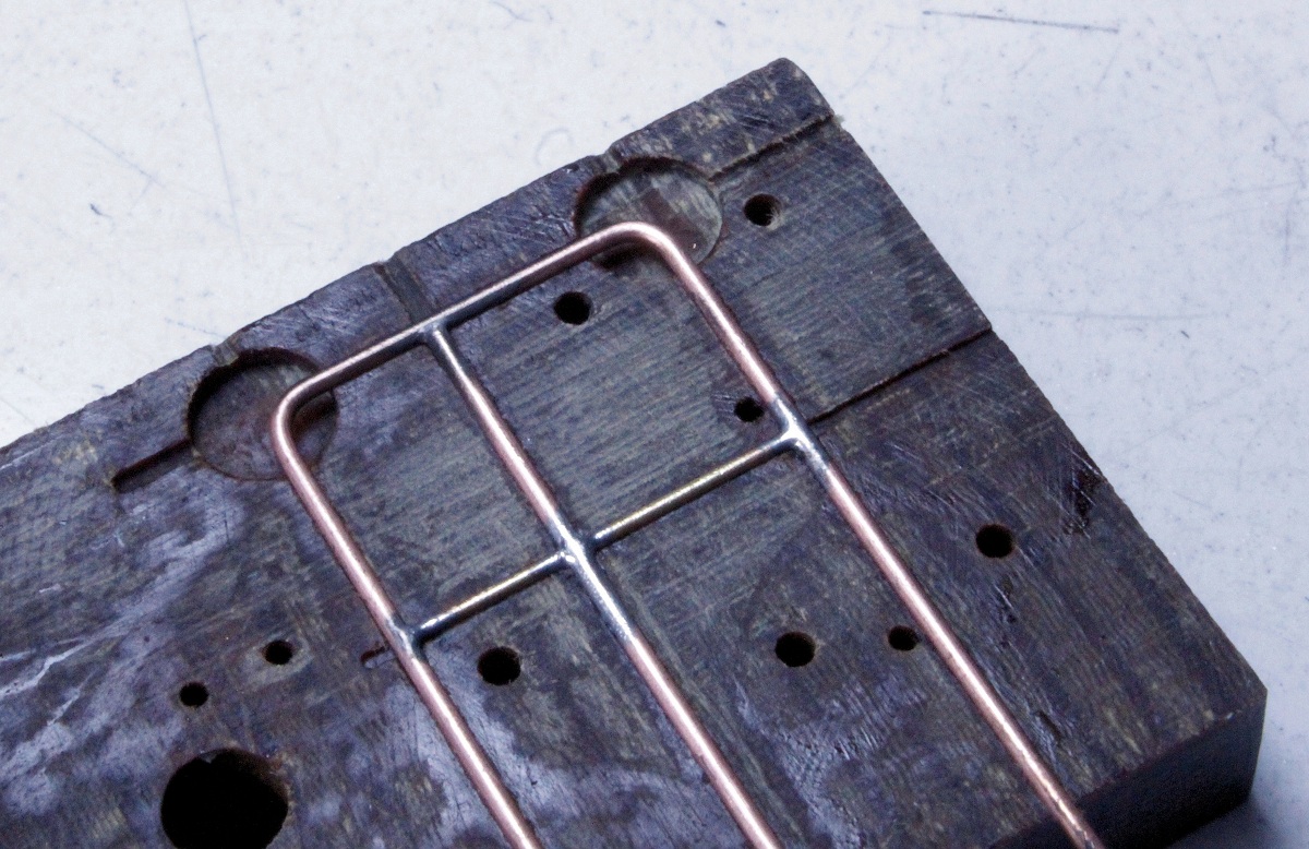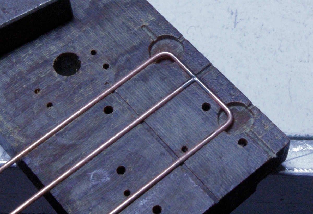 Biegen der Bügel aus 0,8-mm-Cu-Draht um zwei Rundungsbolzen als Beginn. Der