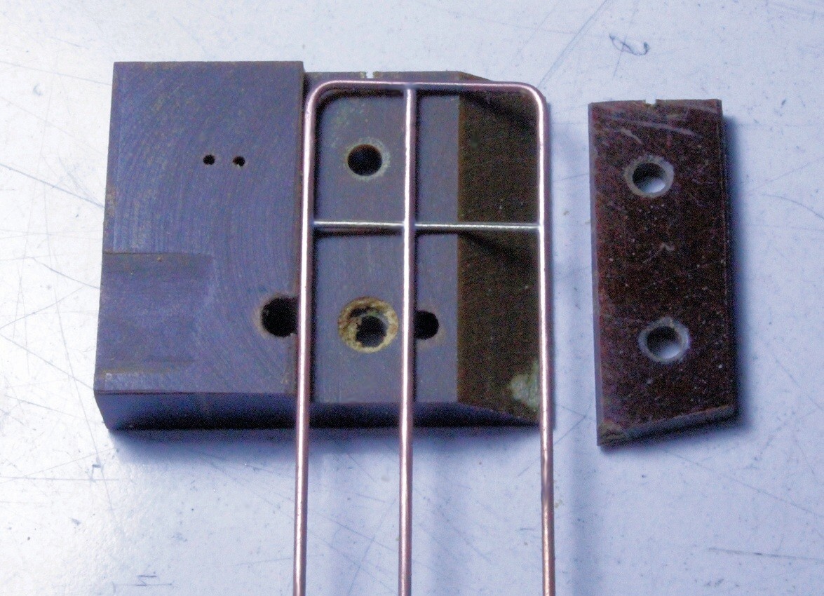 Rechts liegt ein "Spanneisen", mit dem das Biegeteil auf der Biegevorrichtung
