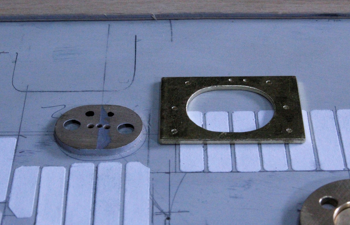 wird gefertigt. Links (auf der Bohrvorrichtung liegend) und in der Mitte sind