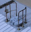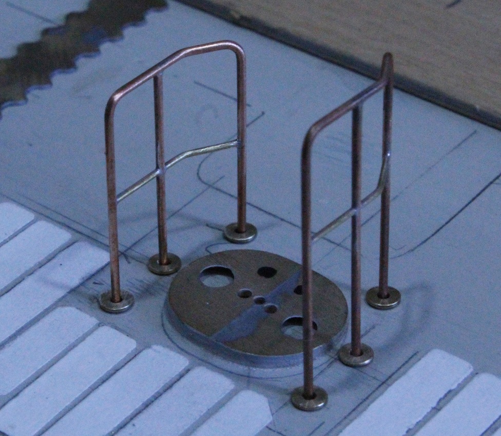 Bei einer der ovalen Decksluken auf dem Backbord-Seitengang sind seitlich zwei relinghohe Schutzbügel zu sehen. Ich deute sie als Sicherheitsreling. Kein Seemann soll offenbar bei offenstehender Luke hineinfallen.