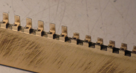 Streifenenden gelötet. Unten liegen im Foto die M0,6-Schrauben (2,5 mm lang) und