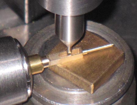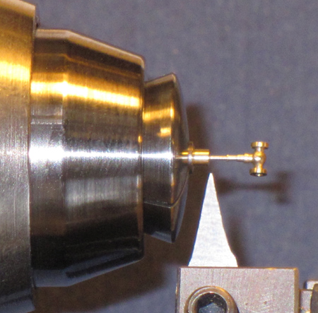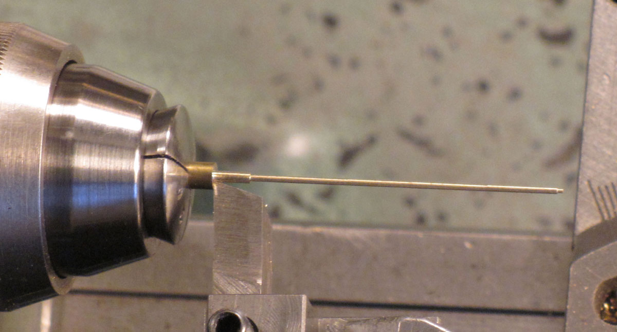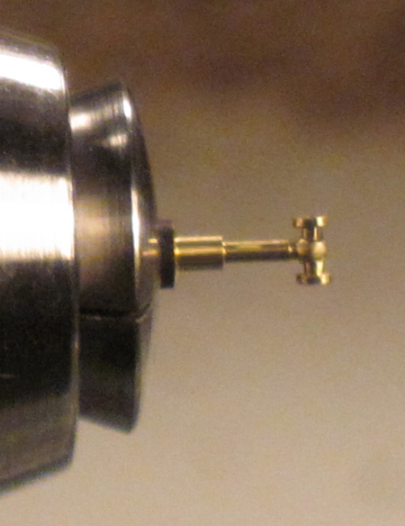 eben gedrehte Sliphebel-Rohling. In der Arbeitsspindel ein 1-mm-Fingerfräser.