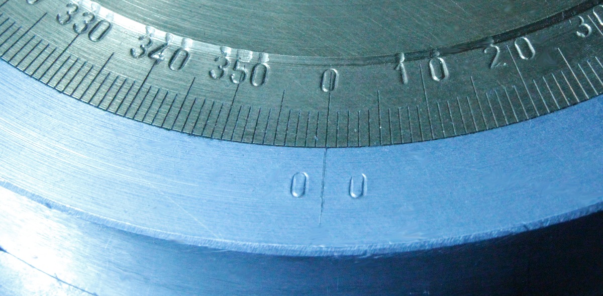 Die 360°-Skala vom Teilgerät mit senkrechter Teilspindel wird auf 0° geklemmt...