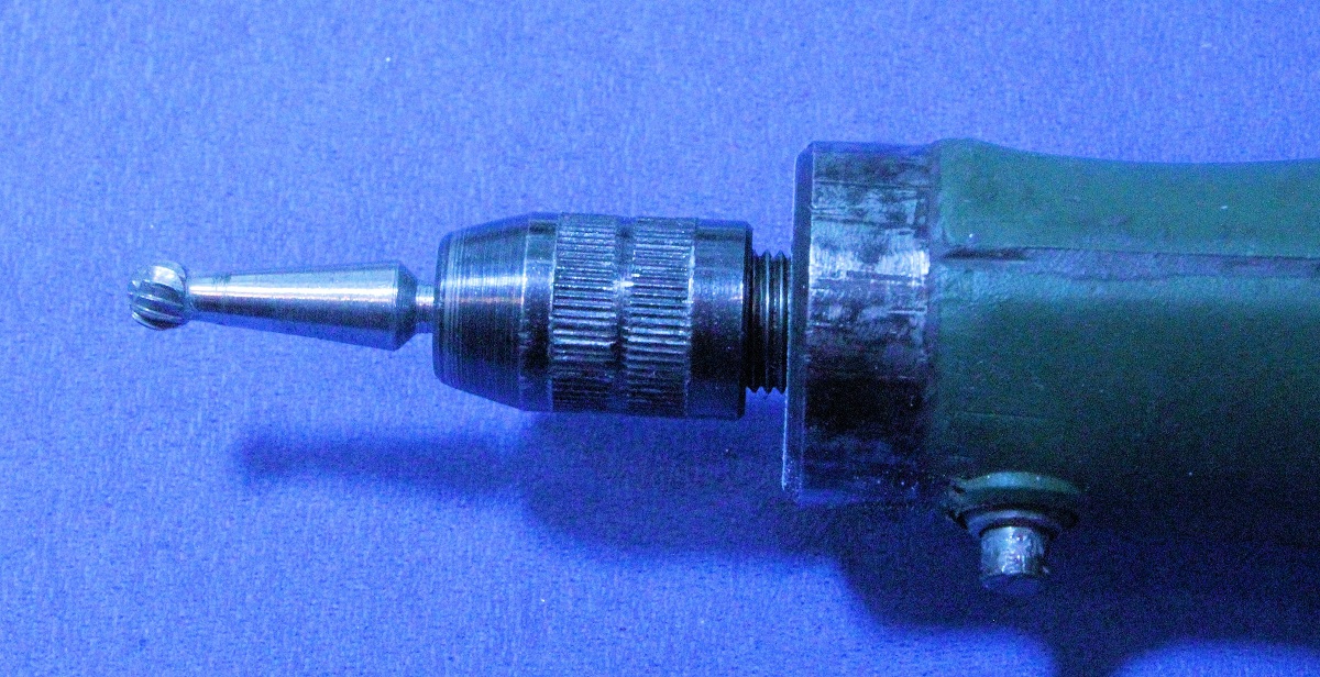 Fräser hat allerdings einen 6-mm-Schaft (oben). Damit ich ihn in einem kleinen (Hand-)Bohr-Schleifer