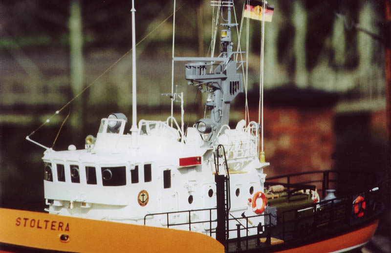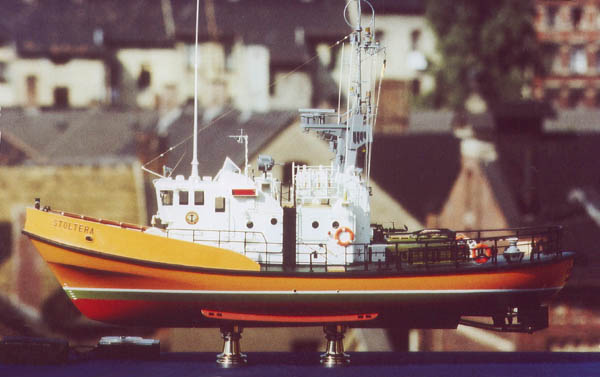 Während einer Kur im Januar 1975 an der Ostseeküste sah ich im Warnemünder Alten Strom den Seenotrettungskreuzer STOLTERA vom Seenotrettungsdienst der DDR an seinem Liegeplatz liegen. Etwa zeitgleich bekam ich den sehr guten polnischen Modellplan vom polnischen Schwesterschiff HALNY (beide von Typ R-17) in die Hände. Die STOLTERA habe ich gründlich fotografiert (Foto-CD erhältlich!) und noch während meiner Kur die Verbindung zum Seefahrtsamt der DDR, dem Eigner des kleinen, aber sehr schönen Rettungskreuzers hergestellt. Wie schon mehrmals wurde dann zuerst ein Modellplan "HALNY/STOLTERA" gezeichnet und danach das Stand-Modell STOLTERA im M 1:25 gebaut. Einige Ansichten von dem schönen Modell: