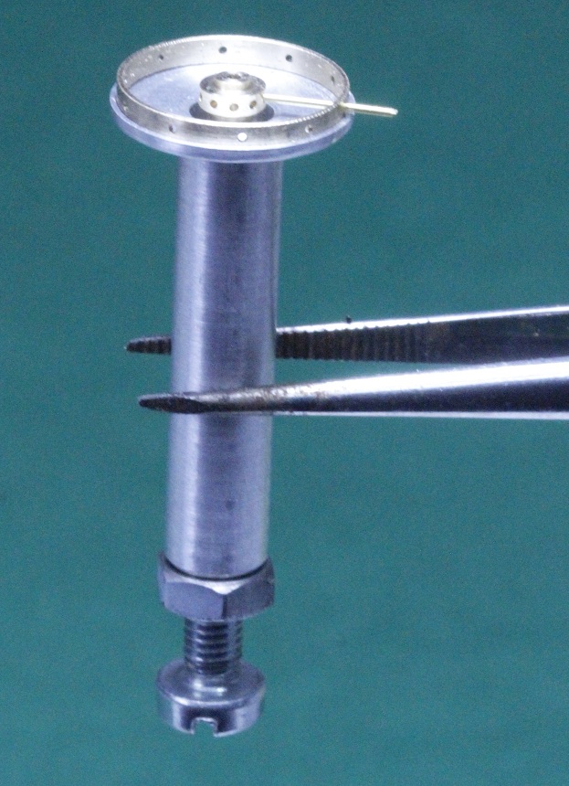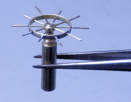 einer Pinzette halte ich beim Anlöten der Speichen den Ring fest.