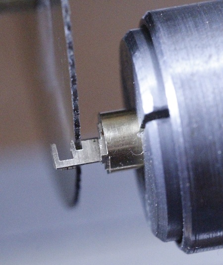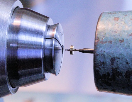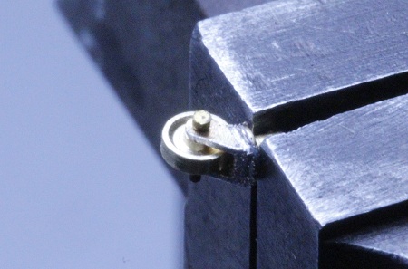 Dazu stecke ich das Rad auf einen 0,4-mm-Bohrer, der in der Reitstockpinole