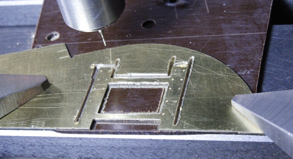 0,4-mm-Ms-Blech gefräst und zwanzig 0,4-mm-Bohrungen gebohrt. Eine