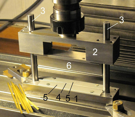 dem 90°-V-Prägeprisma als Matritze (4)(nur 0,35 mm tief eingefräst) und Oberteil (2) sind