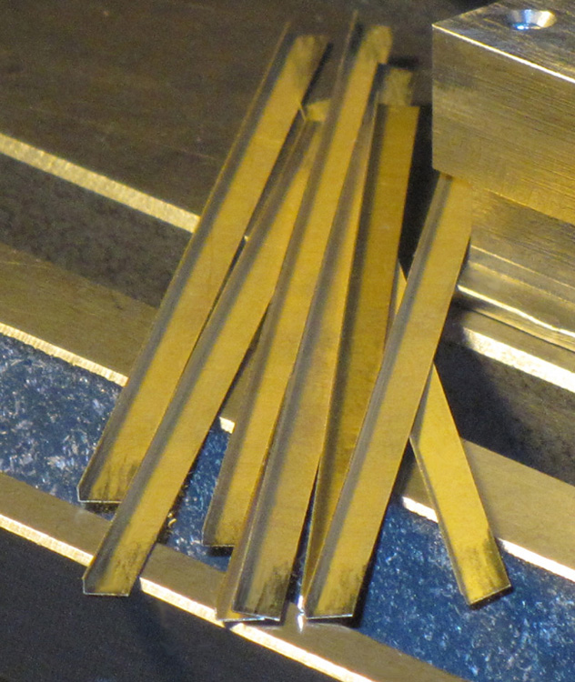 Ich habe eine ausreichende Anzahl (auf der Fräsmaschine) selbst geschnittene Messing-Blechstreifen 0,2 x 4 x 150 mm zu Winkeln 2 x 2 x 150 mm geprägt. Für die WABO-Lager benötige ich jedoch Blechwinkel 1,4 x 1,4 mm.