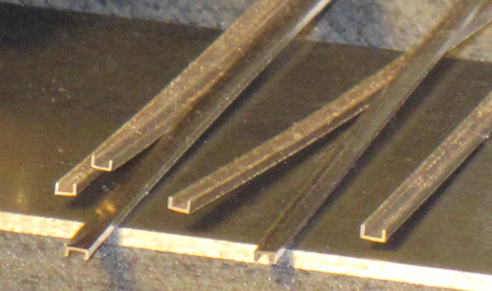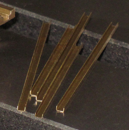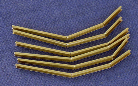 Für die sechs Wasserbomben-Werferstationen sind sechs WABO-Lager anzufertigen; drei "linke" und drei "rechte", weil die Ausführung an der anderen Bordseite spiegelbildlich ist. Ich beginne mit den sechs oberen "Regalkästen". Dazu sind zuerst "Winkeleisen" aus 0,2-mm-Messing-Blech anzufertigen.
