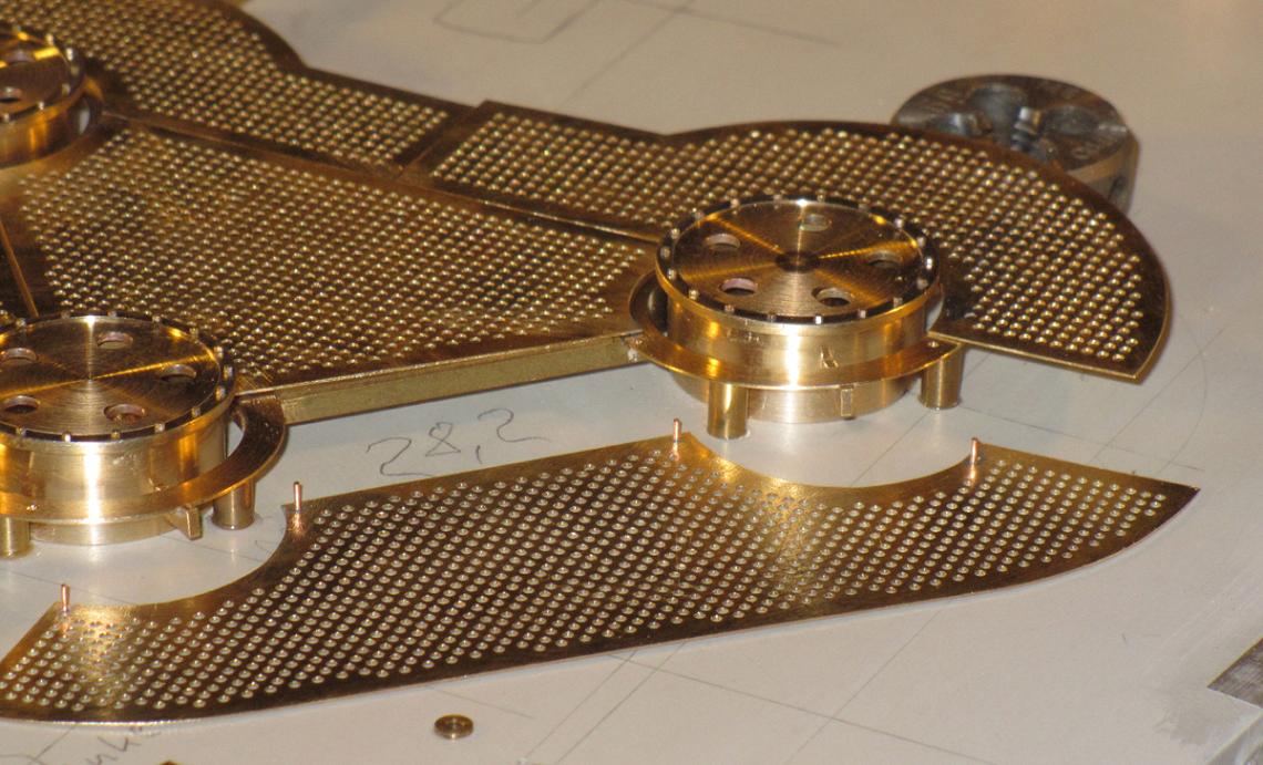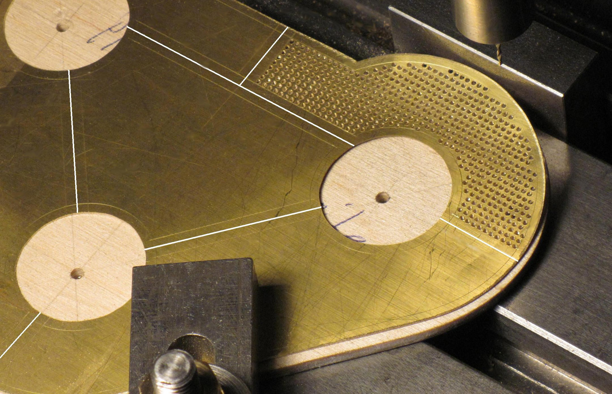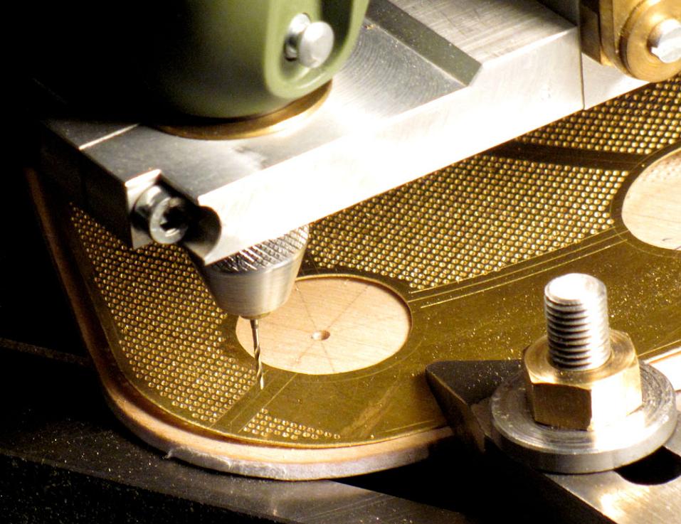 0,85-mm-Wendelbohrer schon eingebohrt, Abstand der Bohrungsreihen: 1,3 mm. Bei